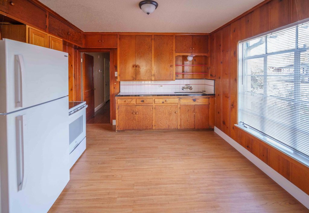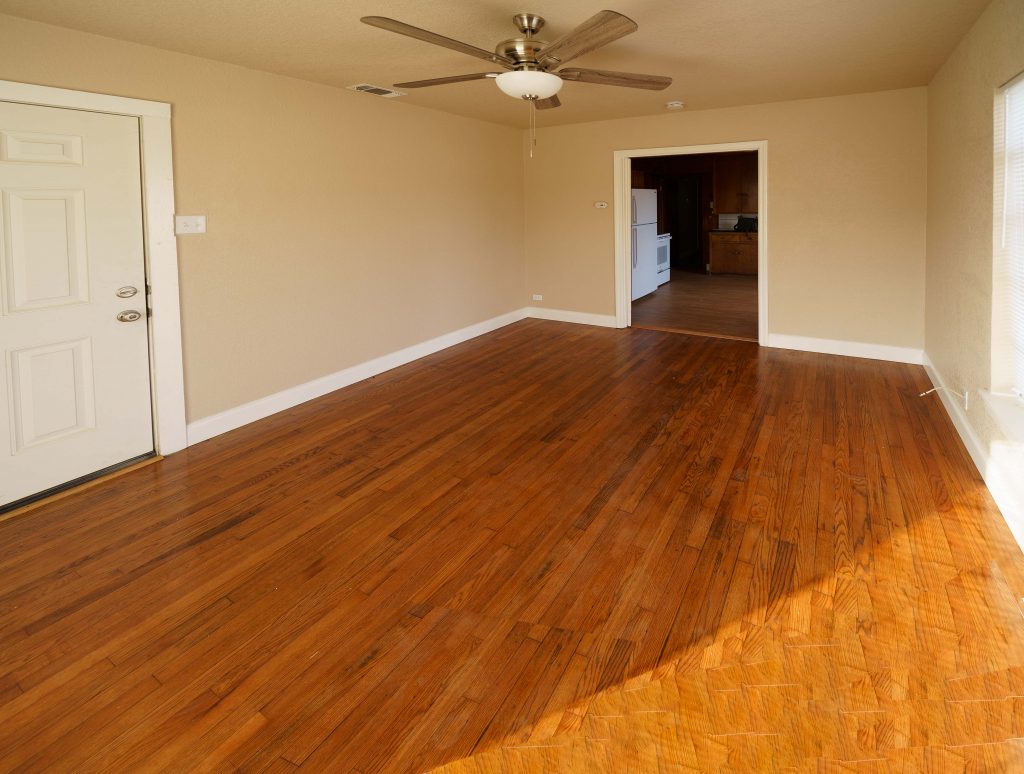 The apartment is 716 square feet. It has a large living room, a kitchen/dining room, two 12×12 bedrooms, one bath, and the use of half of a two car garage (with a wall between the halves).