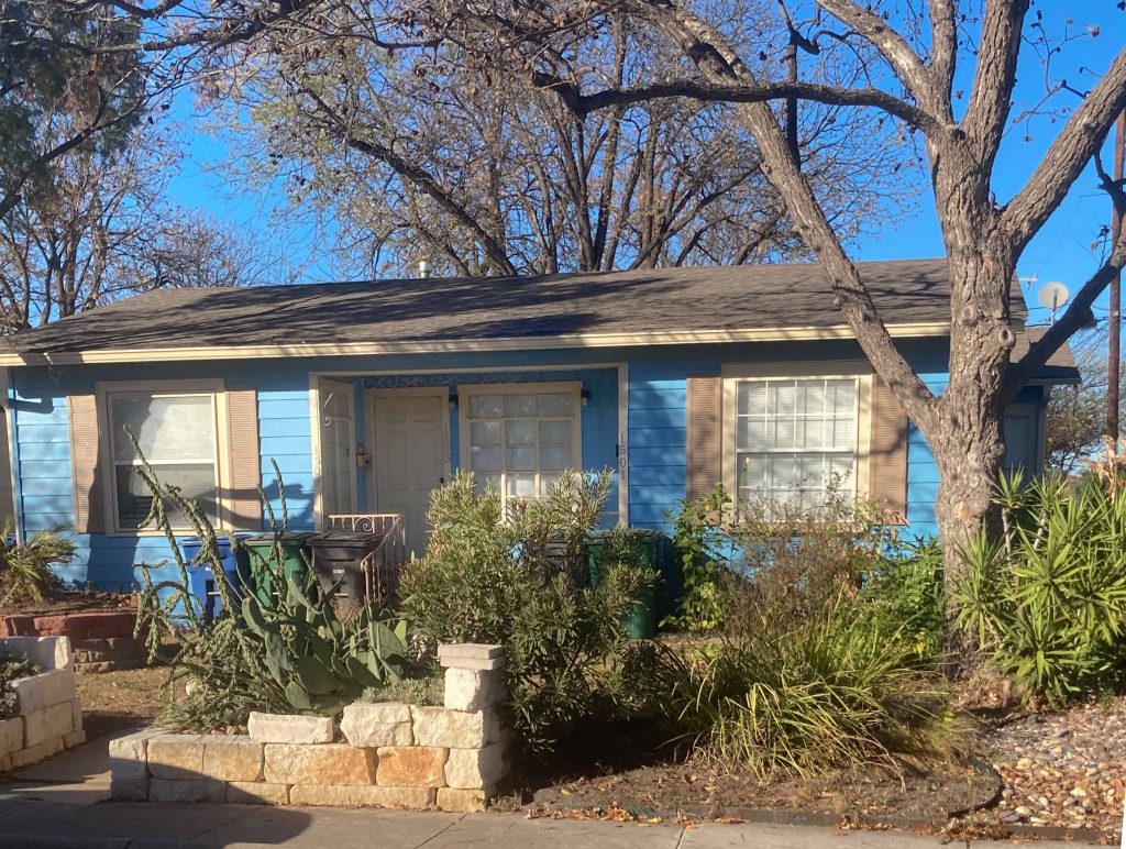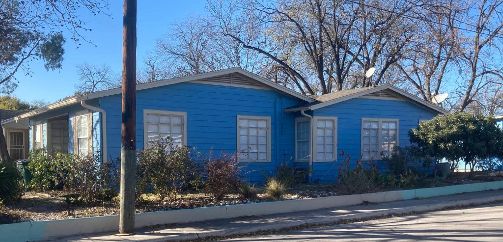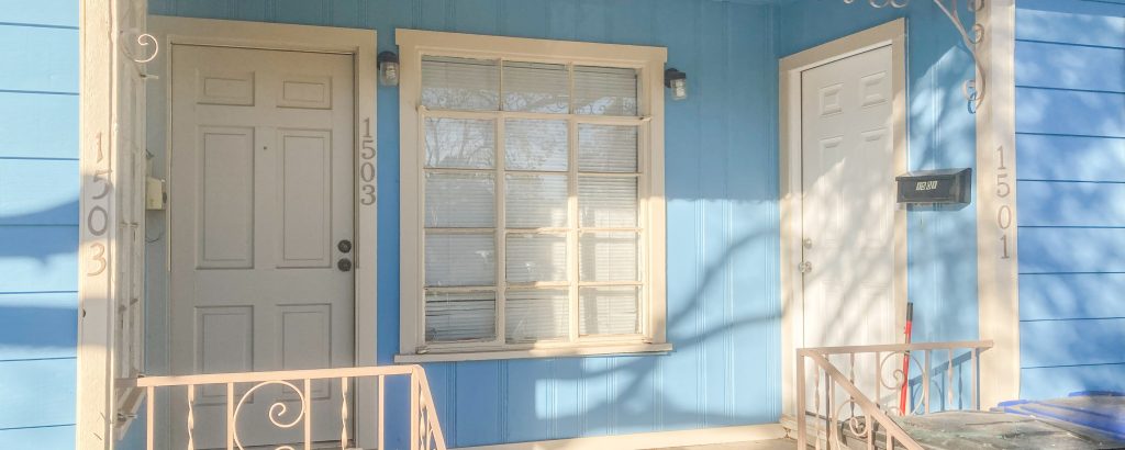 The apartment is a bit over 500 square feet. It has a large living room, a kitchen, one 12×12 bedroom, one bath, and the use of half of a two car garage (with a wall between the halves).